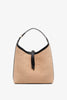 Beige raffia shoulder bag from Chloé. The Marcie shoulder bag is made of lightweight raffia, trimmed with black smooth leather featuring the brand's signature metallic piece on the leather handle. It is complete with gold-toned studs, dangling tassels along with a zipped pocket.