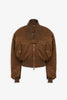 Brown nylon bomber jacket in nylon with contrast ribbed trims at the maxi collar, waist and cuffs. It has snap-button flap pockets and a zipped sleeve pocket.