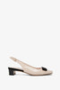 Ballet pink slingback pumps from Ferragamo. The Iconic bow slinback pumps are made of shiny calfskin leather complete with a contrast block heel and a signature grosgrain bow in front.