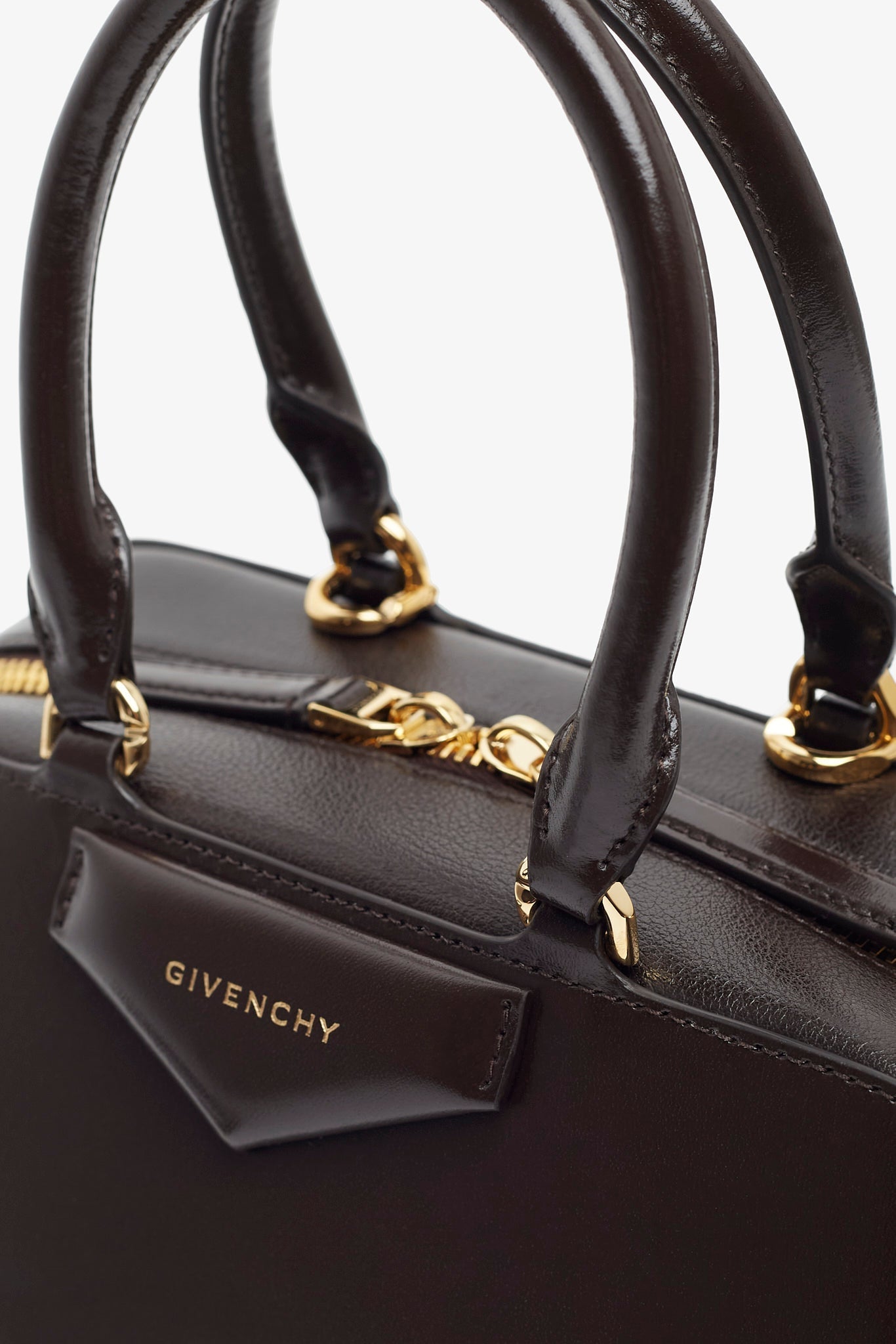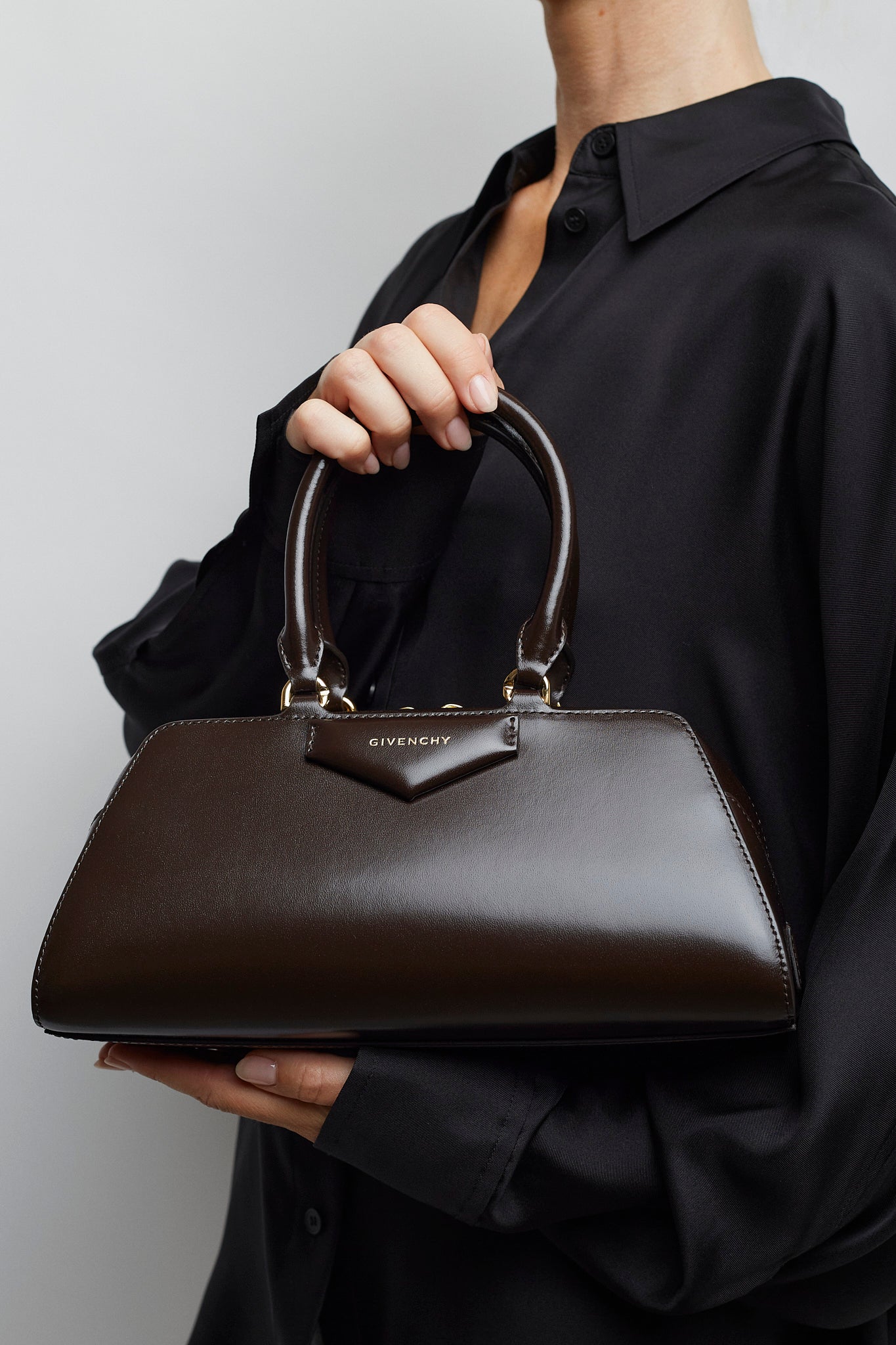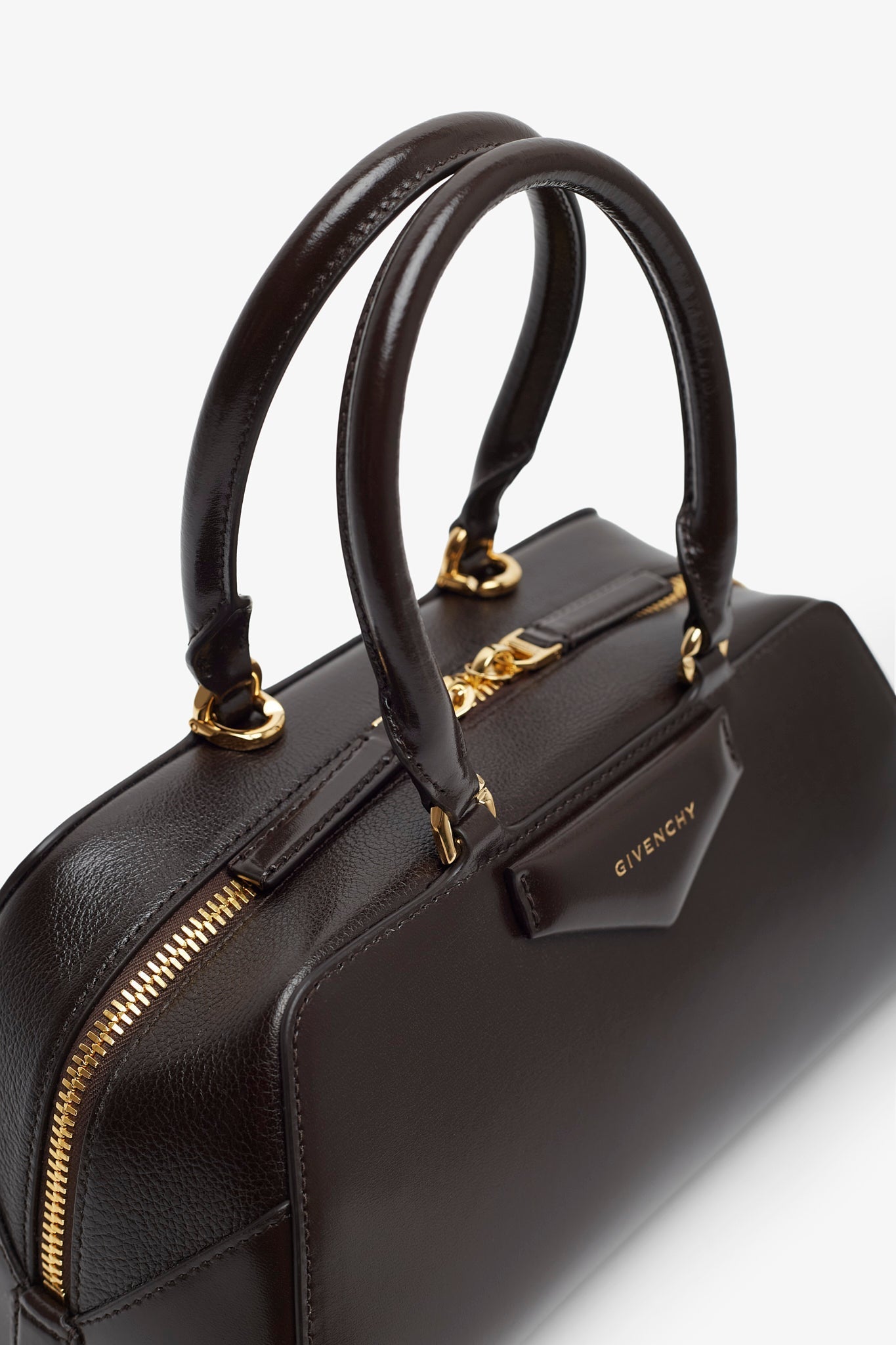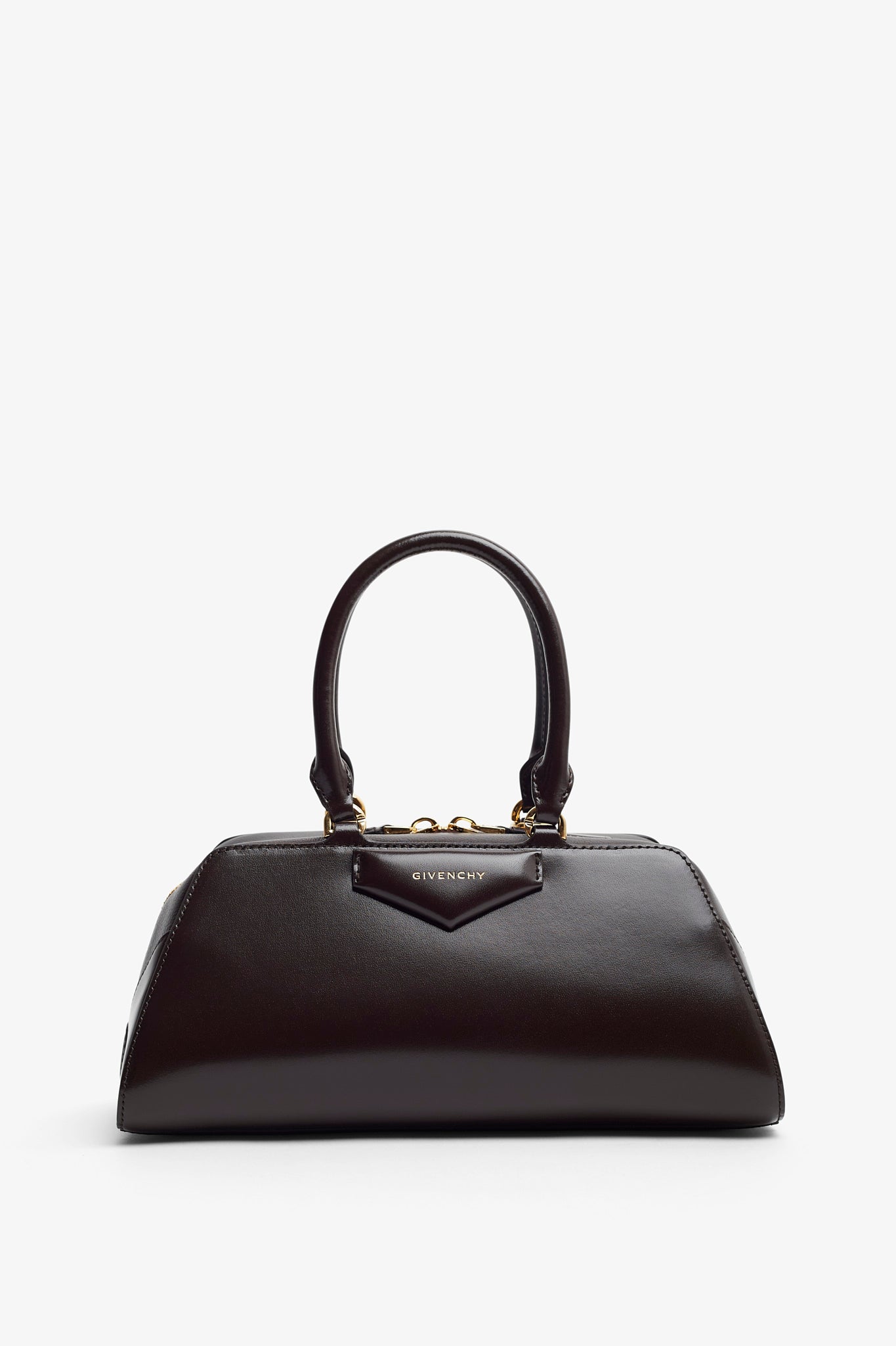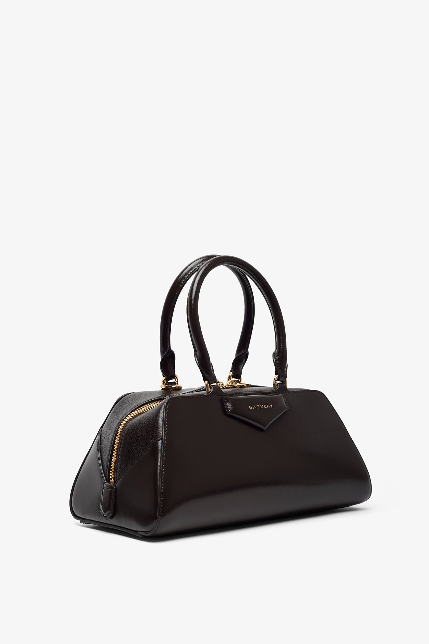 Brown leather handbag from Givenchy. The Antigona east west small handbag is made of calfskin leather, in a long east-west shape with origami-style gusset construction with zipped closure. It has articulated leather handles with four D-rings for the shoulder strap, complete with an adjustable and removable leather shoulder strap.