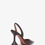 Brown leather slingbacks from Amina Muaddi. The Holli slingbacks are made of leather, mounted on a 95mm sculptural "Martini" heel with an elegantly pointed toe.