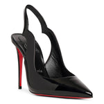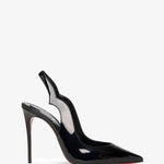 Black patent leather pumps from Christian Louboutin. The Hot Chick sling pumps are a new Christian Louboutin design featuring a bold cut enhanced with a pointed toe and an ankle strap with V-shaped notches. It is made of black patent leather, set on a 100 mm stiletto heel.