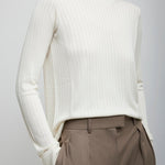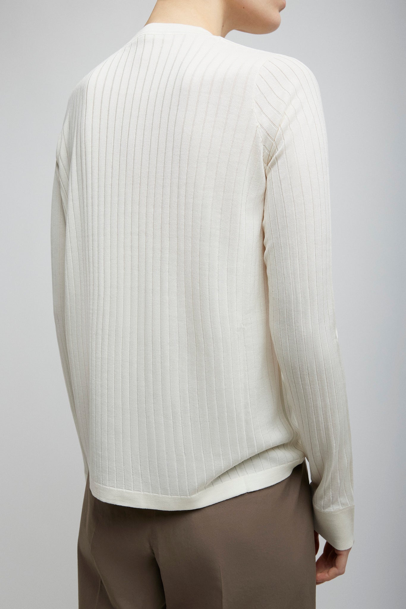 White long-sleeved crewneck top in fluid viscose silk with straight fit and ribbed neckline and cuffs.