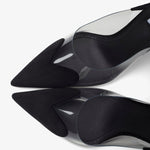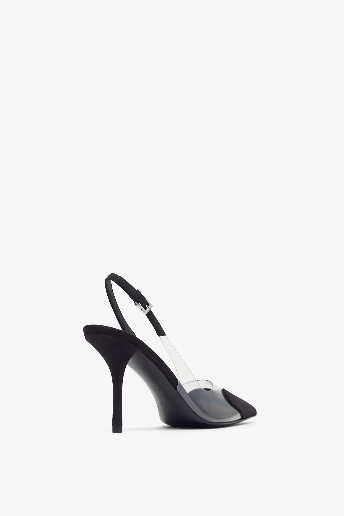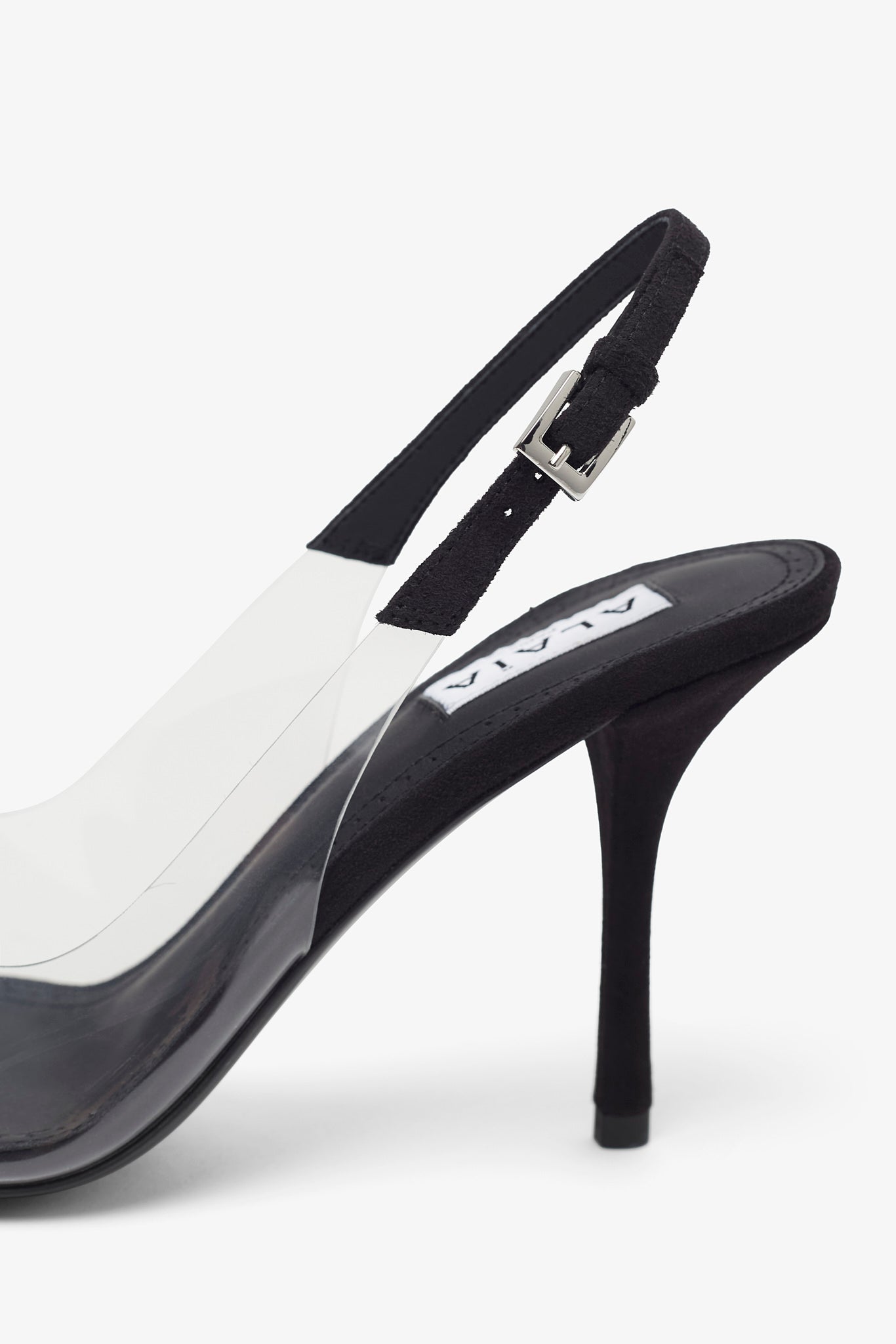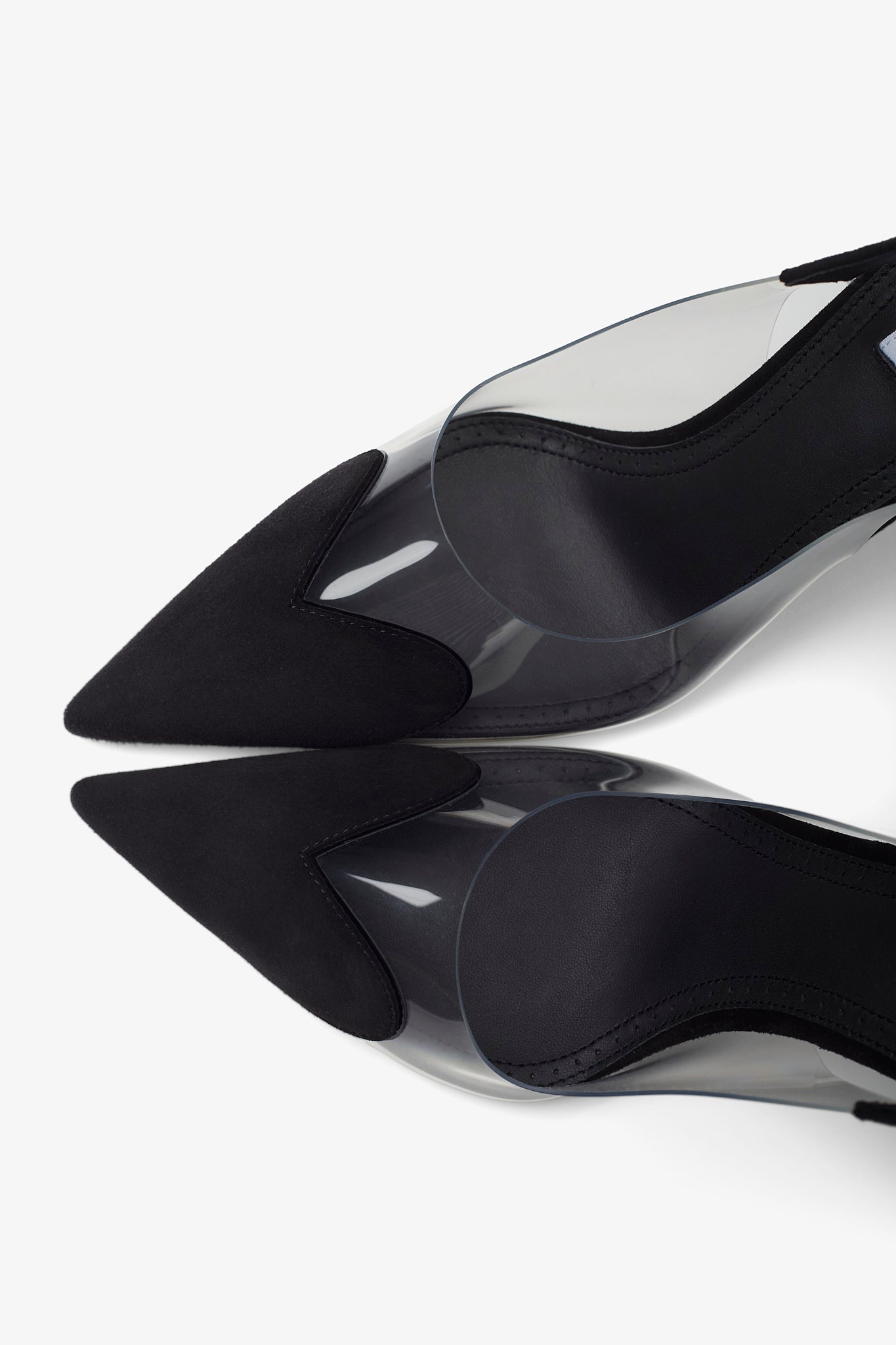 Black suede and pvc slingback pumps from Alaïa. The Coeur slingback pumps are made of clear pvc and suede, feature a flattering heart front cut along with a sharply pointed toe. It is set on a new shaped slim stiletto heel measuring 90mm.