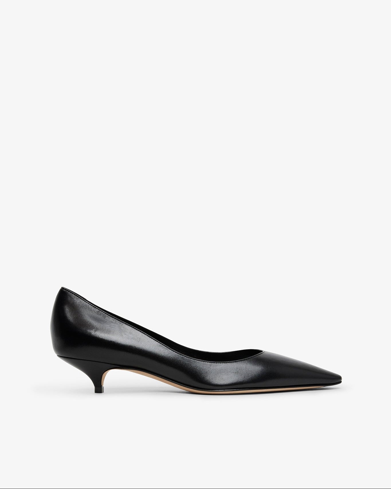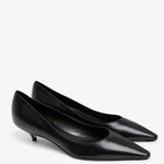 Black leather kitten pumps from The Row. The Liisa pumps are made in soft lambskin leather with a pointed toe, set on a 40mm kitten heel.