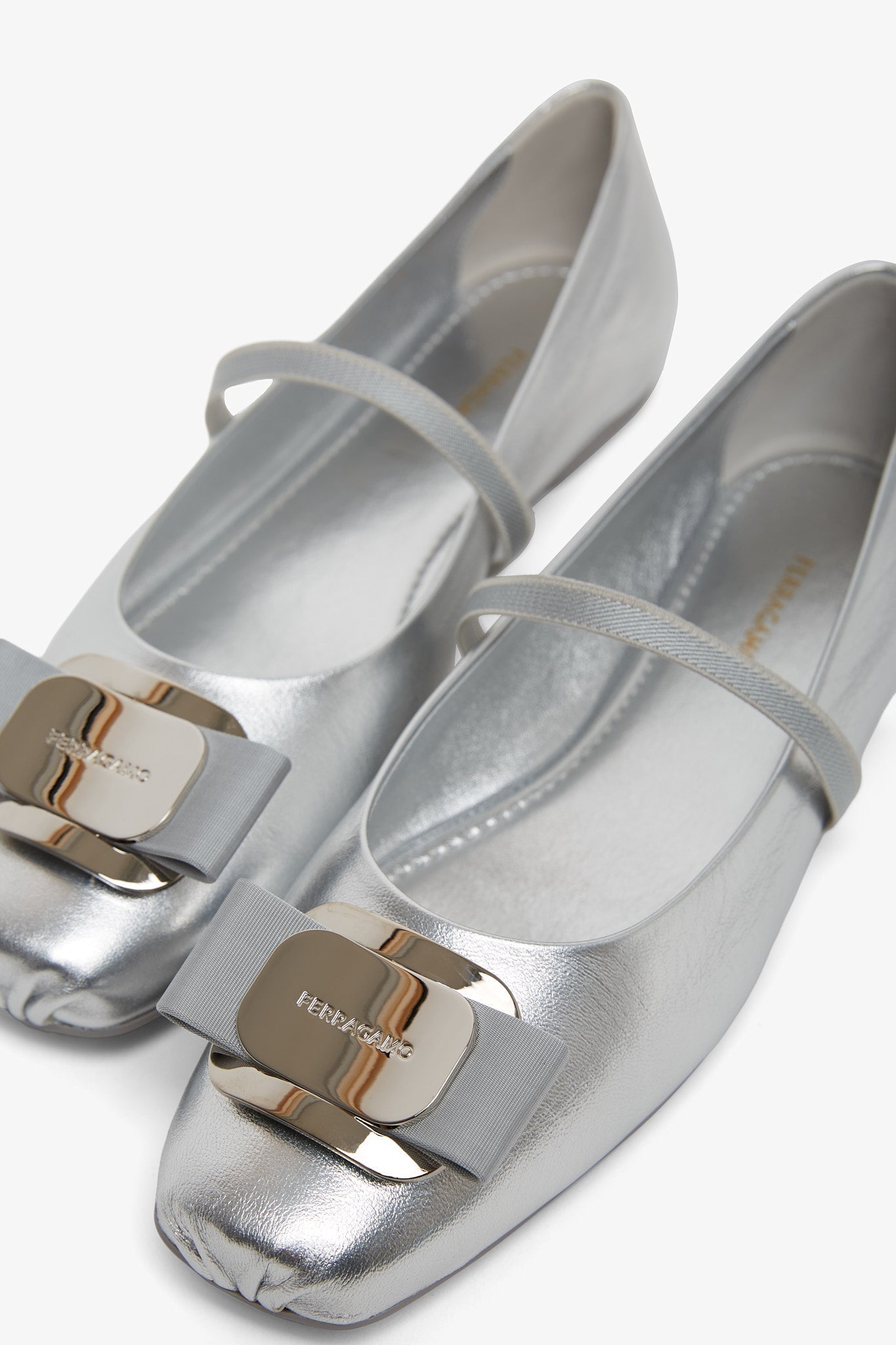 Silver leather ballet flats from Ferragamo. The Zina ballet flats are made of soft laminated leather with ruffles at the pointed tip. It has a square-shaped toe, a gros grain elastic upper complete with a Vara bow held by the new Ferragamo buckle at the toe.